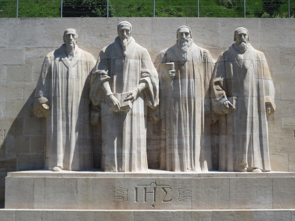 스위스 제네바의 바스티옹공원에 설치된 종교개혁기념비 부조로 제네바에서 종교개혁을 처음 시작한 기욤 파렐, 장 칼뱅, 칼뱅의 후계자인 테오도르 베자, 스코틀랜드 장로교회의 씨앗을 뿌린 존 녹스(왼쪽부터)가 나란히 서 있다. 기념비는 칼뱅 탄생 400주년이었던 1909년 제작에 들어가 1917년 완성했다. 칼뱅이 펼쳐진 성경을 들고 있다. 이들이 서 있는 벽 뒷면엔 ‘Post Tenebras Lux’(어둠 후의 빛)라는 라틴어가 새겨져 있다
